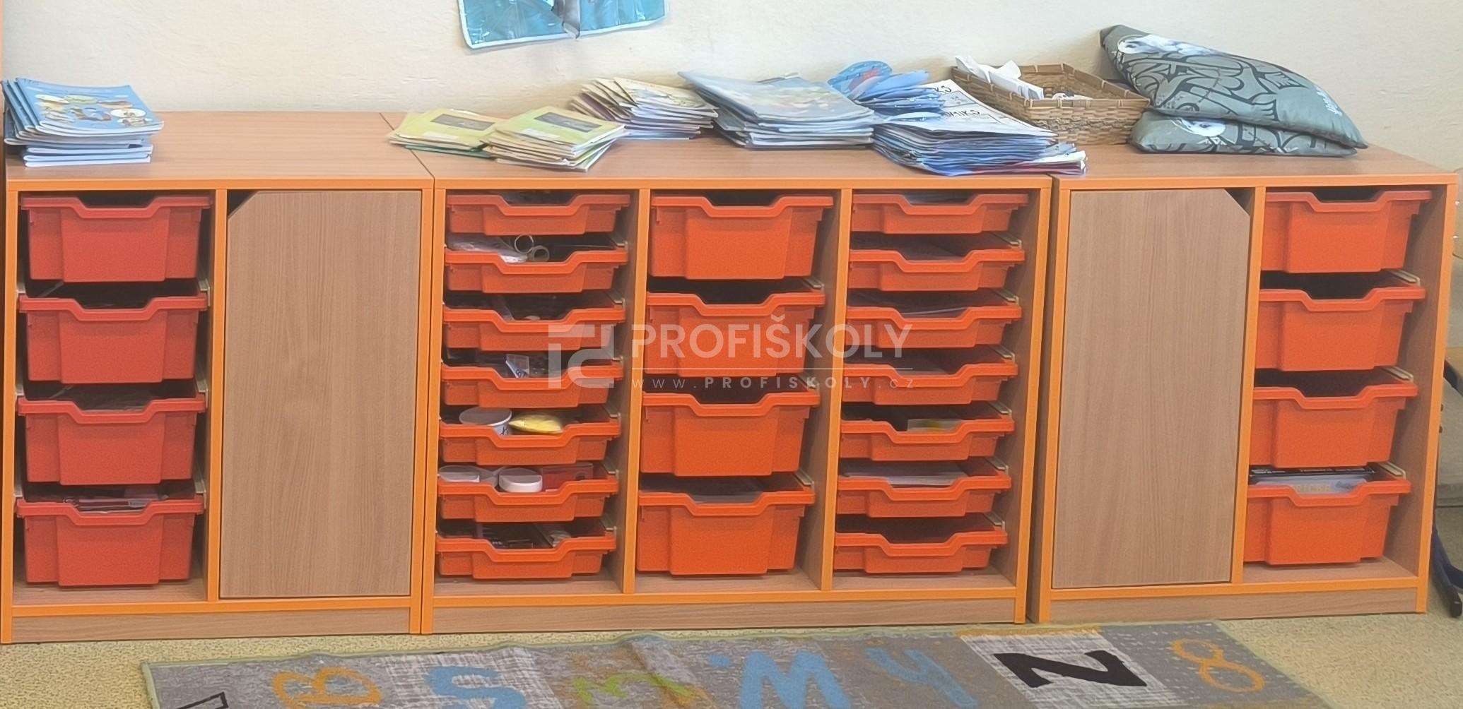 Sestava skříní s barevnými dvířky do školy, družiny, dětských koutků nebo mateřské školy. Nábytková řada školních skříní COLOR se vyrábí v hloubce 450 mm, kde dvířka jsou vložená do korpusu skříně a mají zkosenou hranu. V případě zájmu můžeme dvířka vyrobit bez zkosení nebo s klasickou úchytkou. Tuto nábytkovou sestavu lze kombinovat se skříněmi na plastové boxy (zásuvky). Dřevěné barevné skříně do školy jsou velice oblíbené. Neváhejte nás oslovit s žádostí o vizualizaci vaší nové učebny. Pomůžeme vám s výběrem typů skříněk a barevných kombinací. Pokud nevyberete z nabízených modulů, vyrobíme jakékoliv atypické provedení.