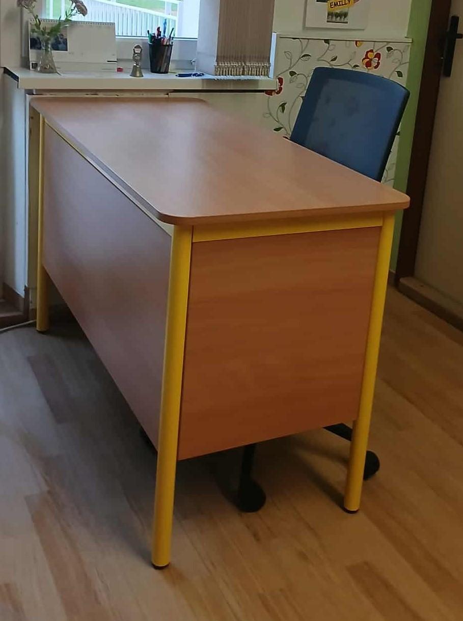 Školní učitelská katedra Dita je vyrobena z plochooválových ocelových profilů. Povrchová úprava vypalovaná prášková barva, součástí konstrukce je zadní krycí deska z lamina. Nohy lavice opatřeny plastovými krytkami v černé barvě. Horní deska z laminované dřevotřísky (1300x600 mm) v dekoru buk tl. 18 mm chráněna kvalitní 2 mm ABS hranou (mohou být oblé rohy). Základní varianta vybavena jednou zásuvkou se zámkem.