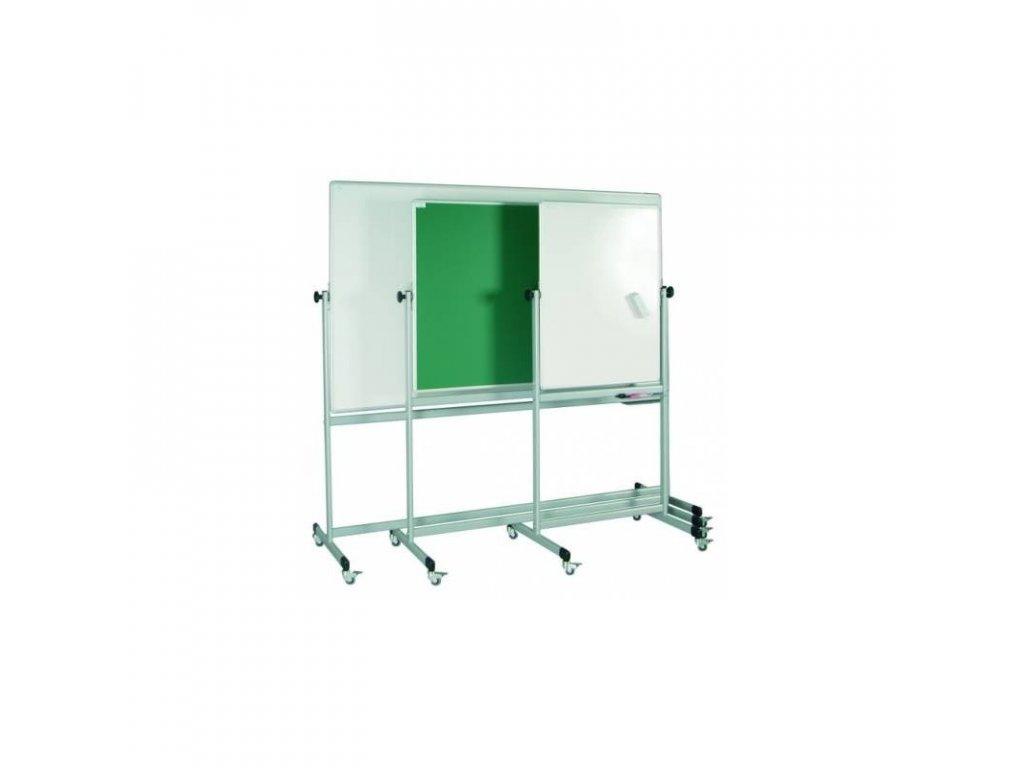 Oboustranná mobilní magnetická tabule na křídu nebo fixy. Keramický či emailový povrch. Rám i odkládací lišta z hliníku, zelená (křída) či bílá (fix) barva popisné plochy, mobilní stojan na kolečkách. Vyrobena v ČR.