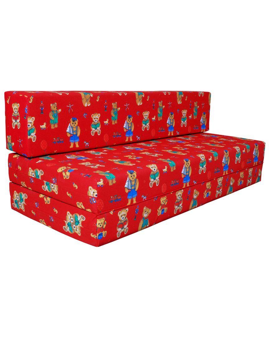 Rozměr: 1200 x 500 x 220 mm. Potahová látka - jednobarevná (bavlna) – žlutá, červená, zelená, modrá nebo dětský motiv (bavlna) – světle zelený medvídek, červený medvídek, žlutý medvídek, tmavě modrý medvídek, tmavě zelená žába. Pohovka snadno rozložitelná.