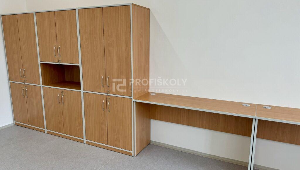 Nezapomněli jsme ani na administrativní část a kabinety. Kancelářský nábytek do školy musí splňovat nároky na organizaci dokumentů i pohodlí při práci. Dodali jsme stabilní kancelářské stoly s velkou pracovní plochou. Prostory jsme osadili policovými regály a uzavíratelnými skříněmi pro archivaci materiálů.