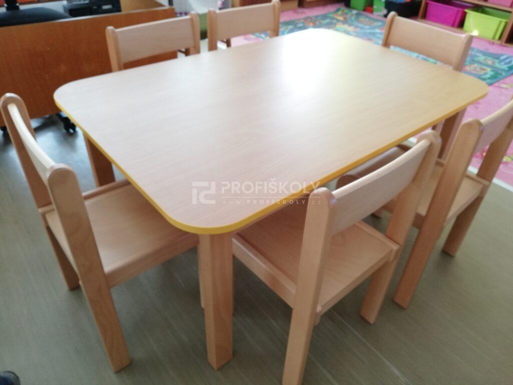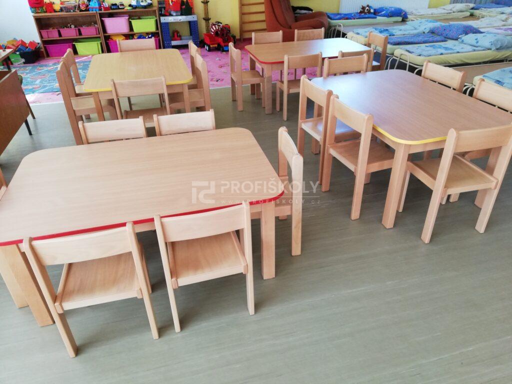 - Hrací a pracovní zóna: Děti mají k dispozici dřevěné stoly a židličky, u kterých barevné hrany nejen chrání nábytek, ale také pomáhají dětem v orientaci.