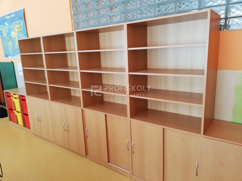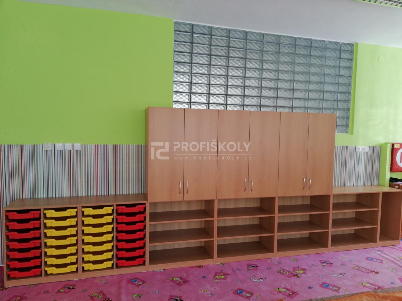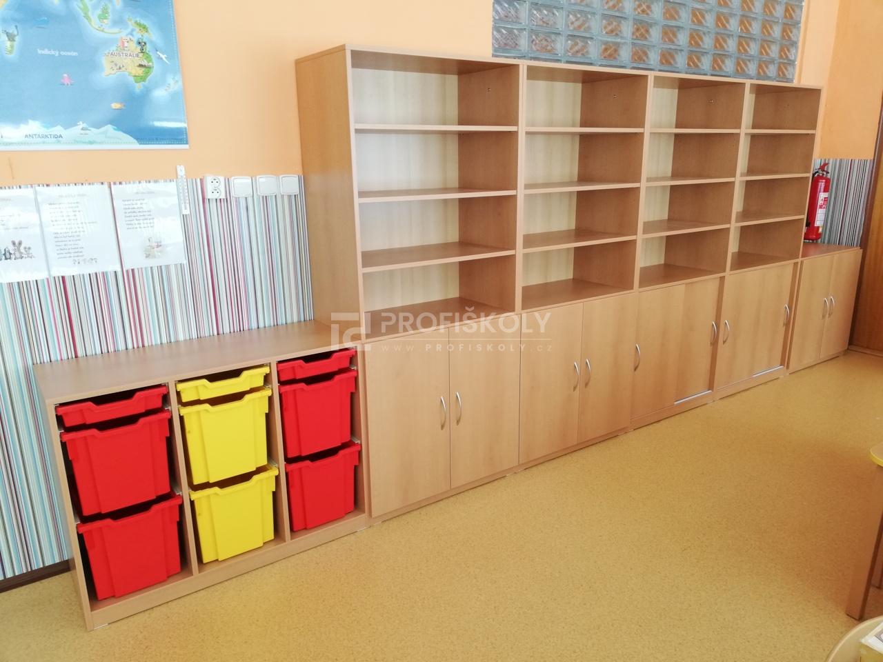 - Úložné systémy: Třídy jsme osadili nábytkovými sestavami s barevnými hranami, které prostor rozjasňují. Maximální pořádek v pomůckách zajišťují regálové skříně s barevnými plastovými boxy, které jsou u dětí i učitelů oblíbené pro svou přehlednost.