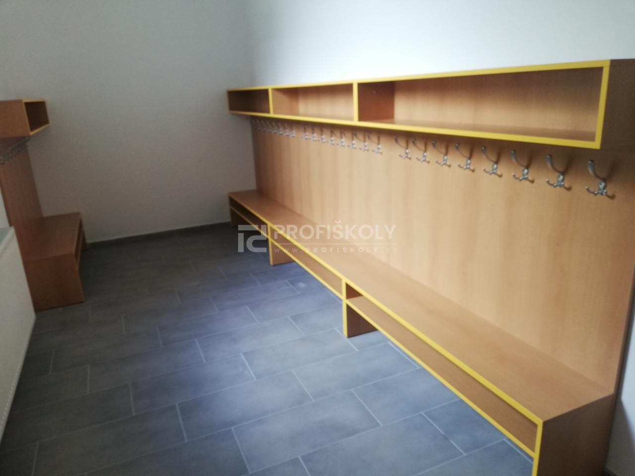 - Šatny: Pro ranní příchody jsme instalovali lavičky se šatní deskou, které obsahují háčky na oblečení i praktickou odkládací polici na čepice a batůžky.