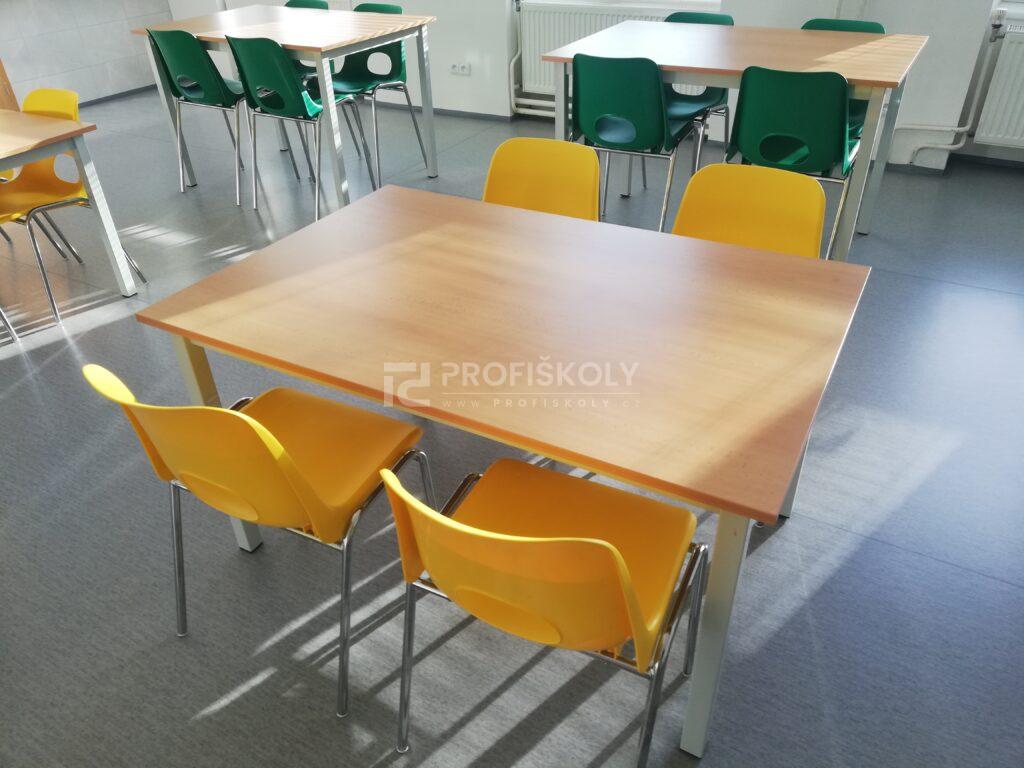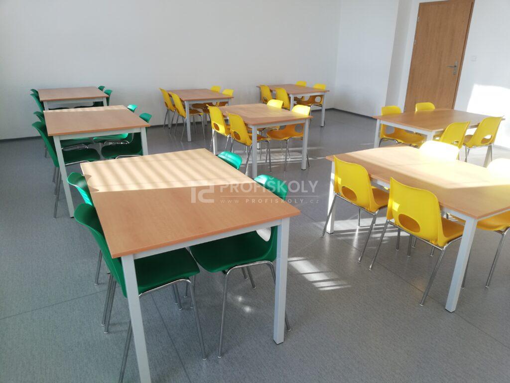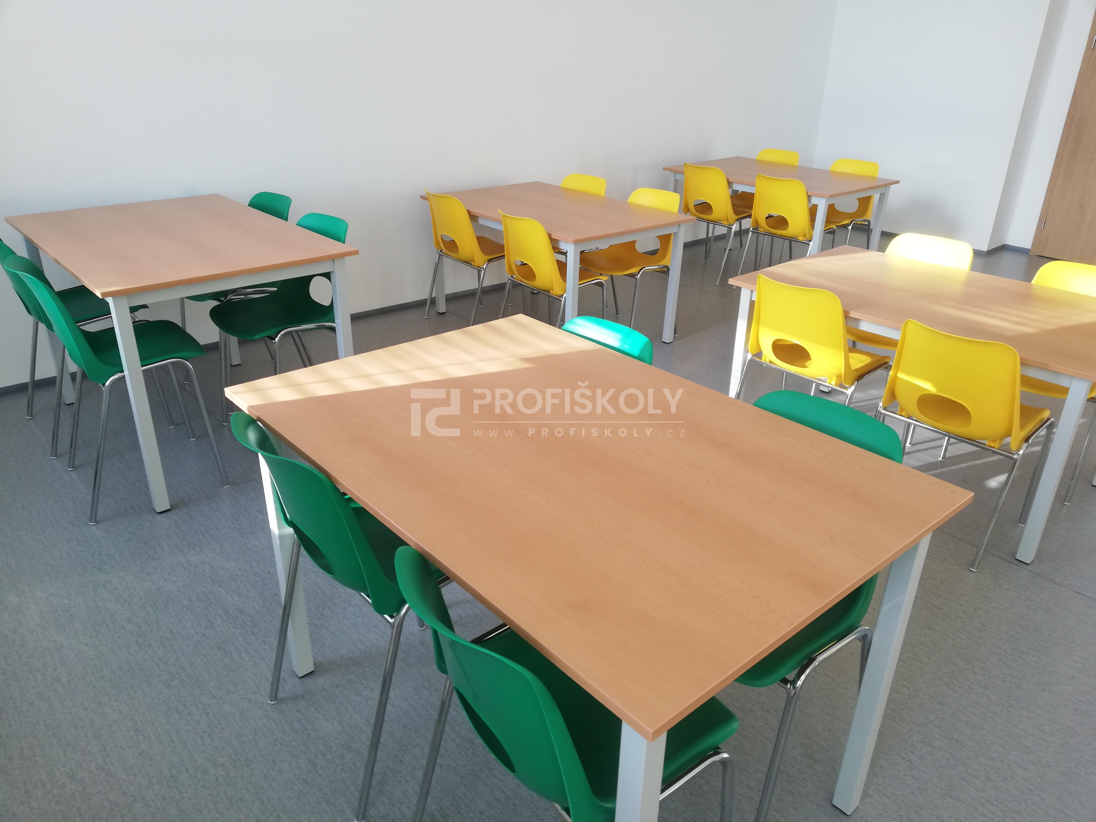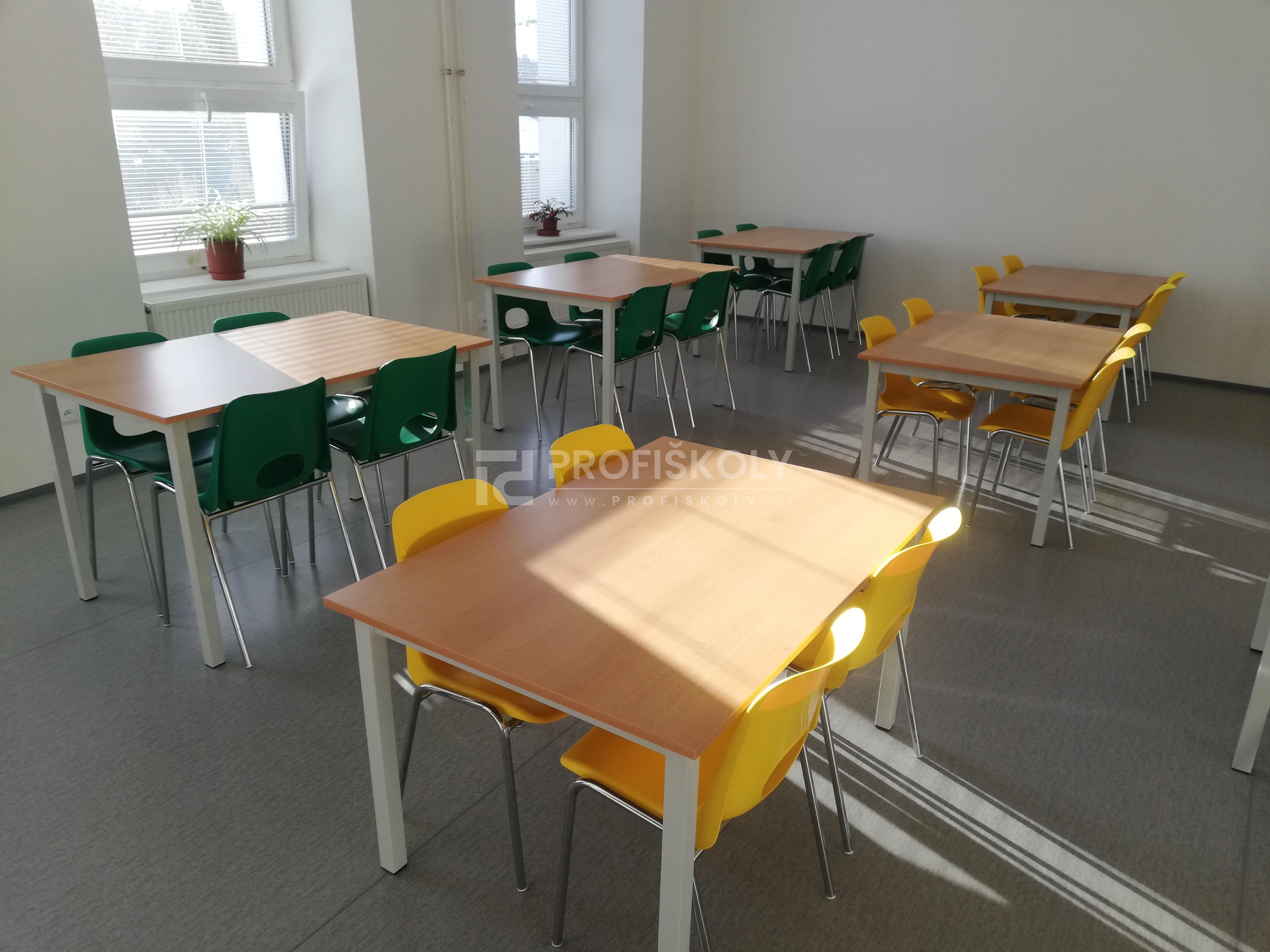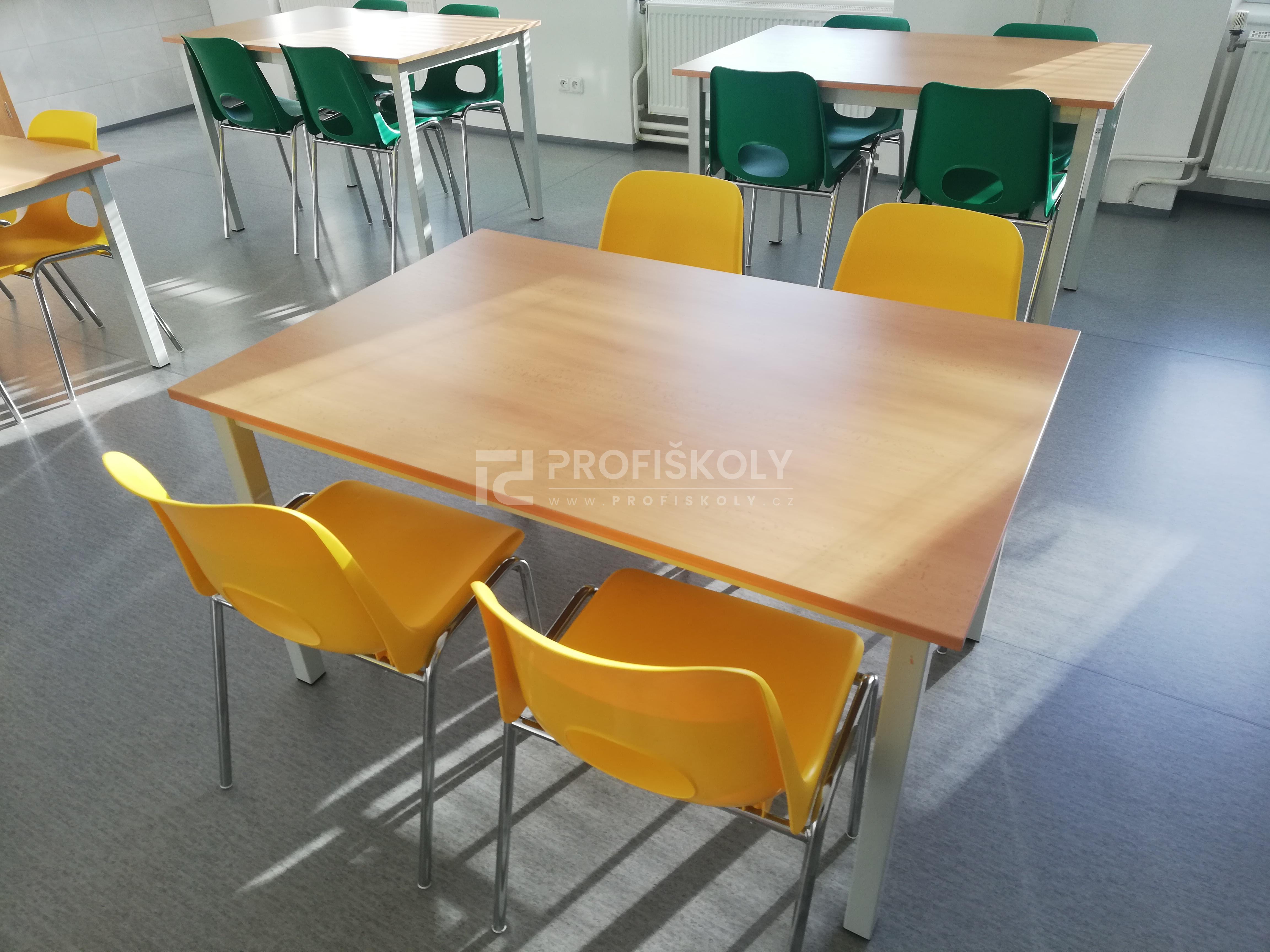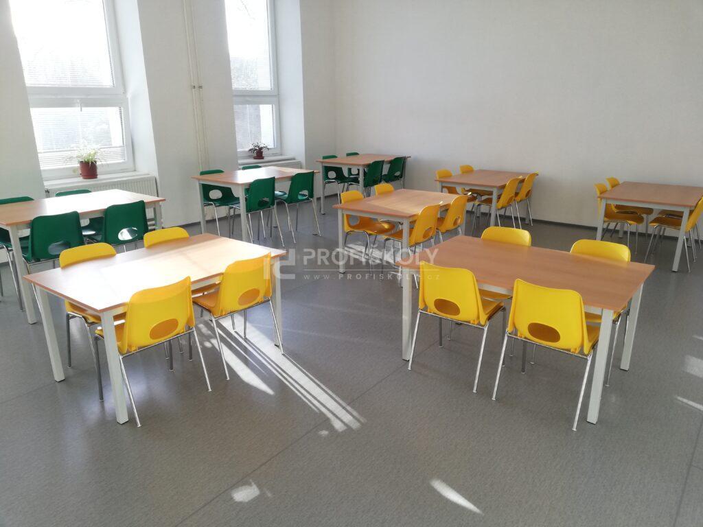 V jídelně, která slouží školce i škole, bylo nutné skloubit vysokou zátěž s estetikou. Instalovali jsme stoly s pevnou kovovou konstrukcí a deskou z odolného lamina. K nim jsme zvolili barevné plastové židle, které jsou: