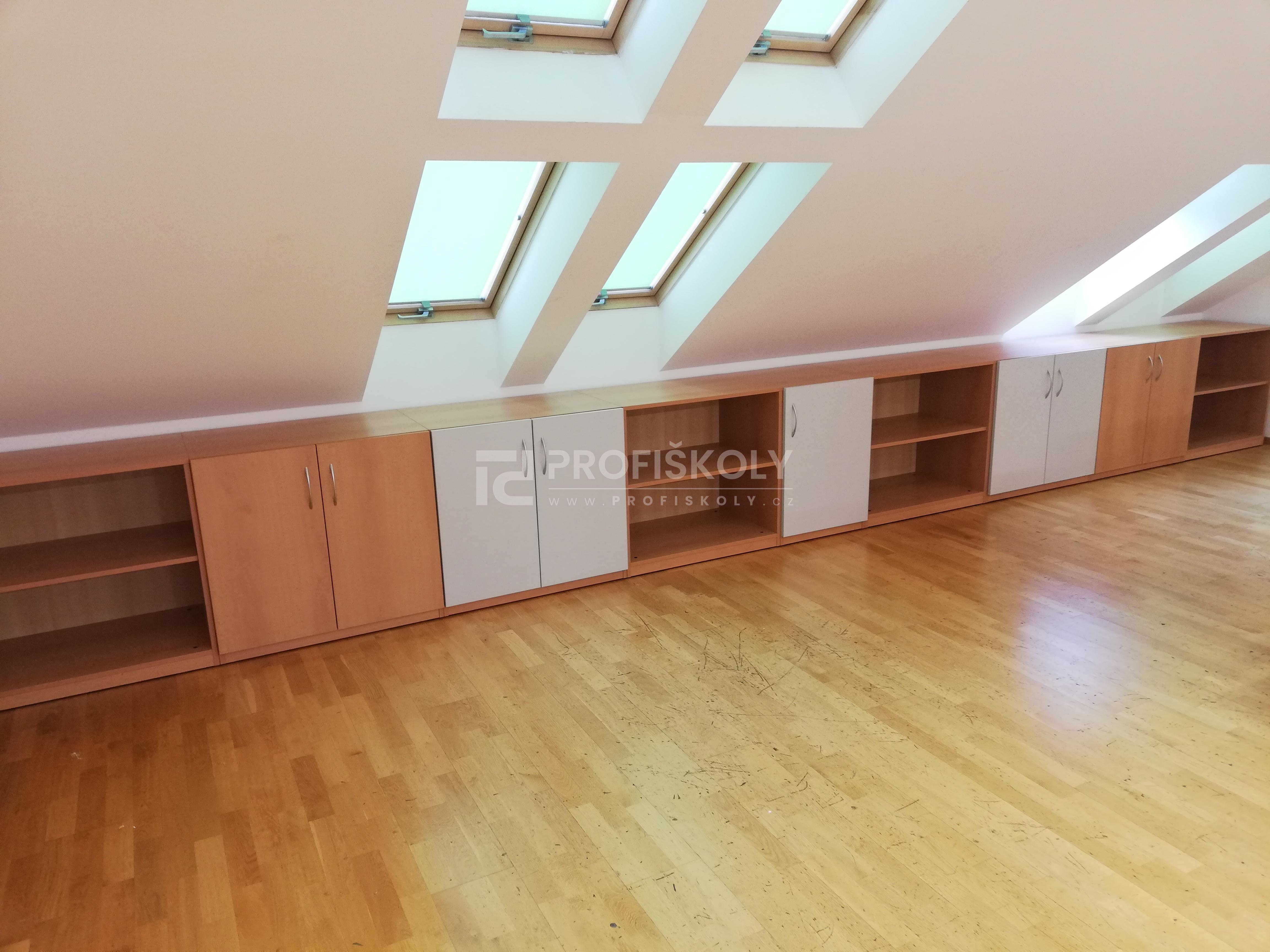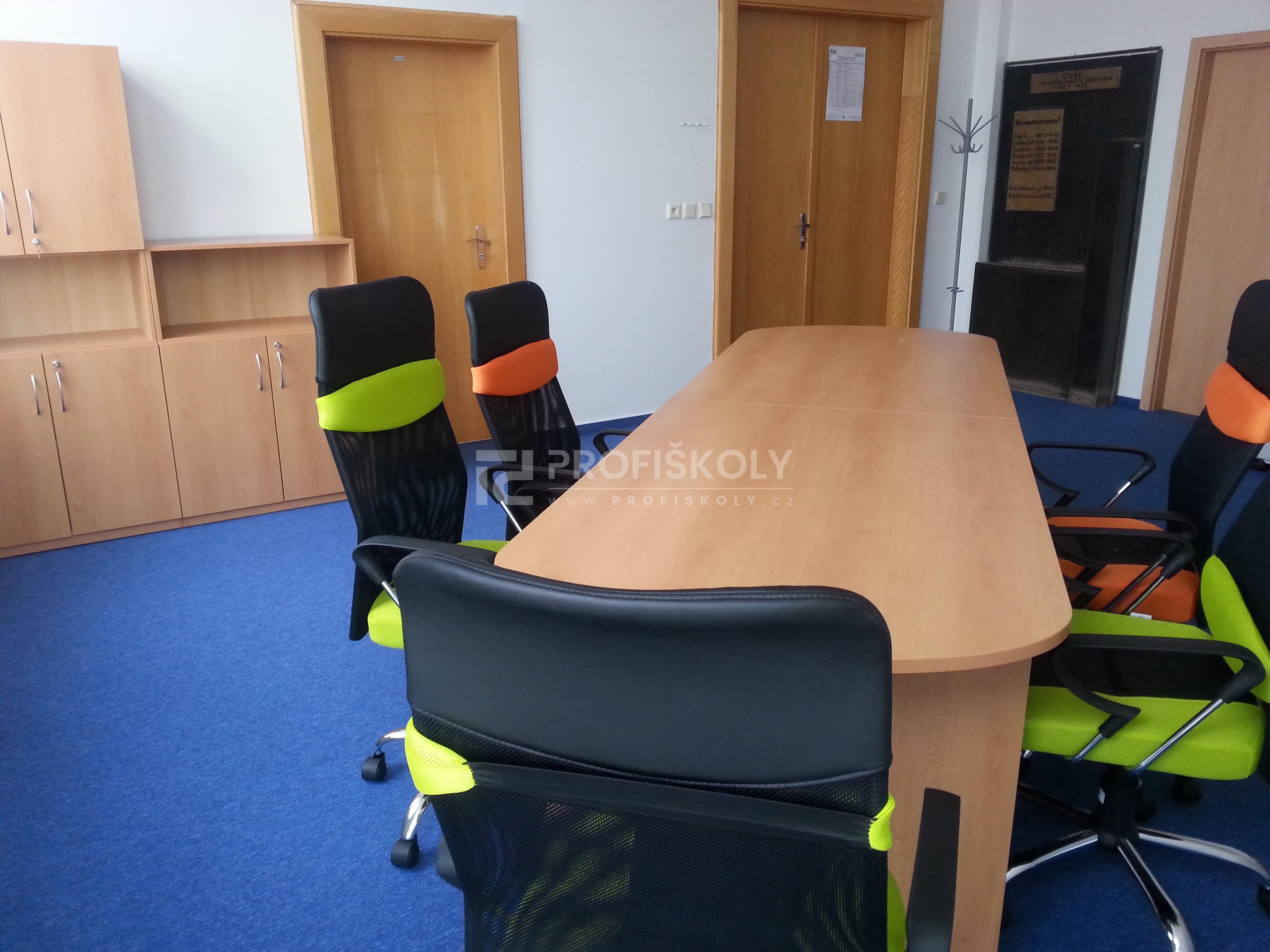 Reprezentativní prostory školy zastupuje zasedací místnost v ředitelně. Zde jsme instalovali dominantní velký pracovní stůl a elegantní skříňky, které tvoří profesionální prostředí pro jednání vedení školy i rady rodičů.
